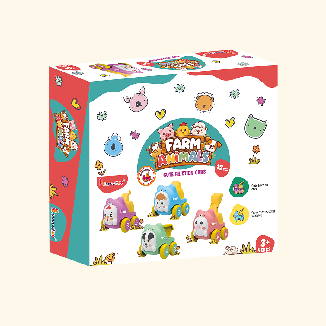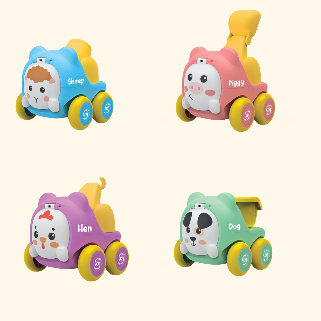 A cute Pack of 4 push-and-go farm animal cars (Sheep, Piggy, Hen, Dog) made for toddler-friendly play.