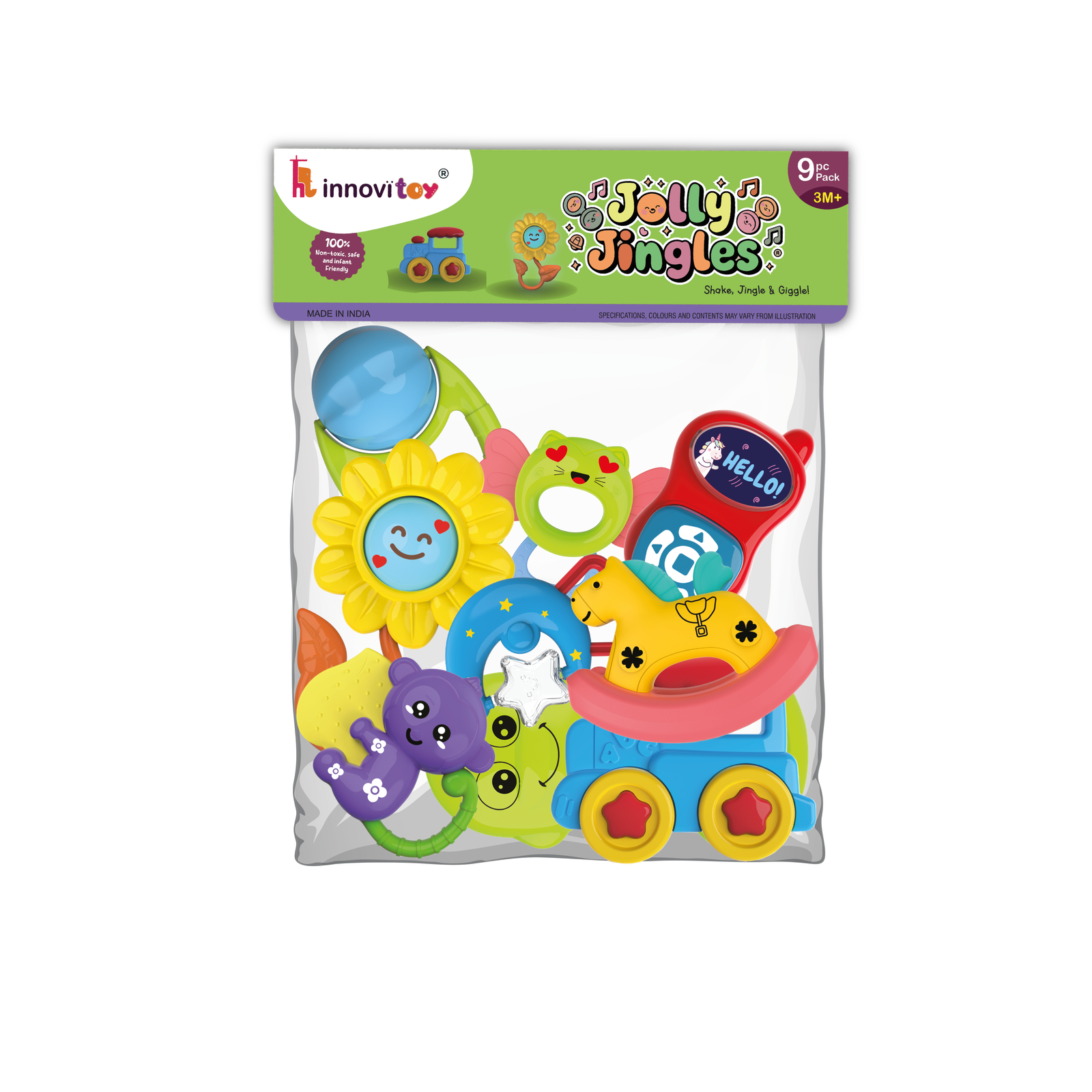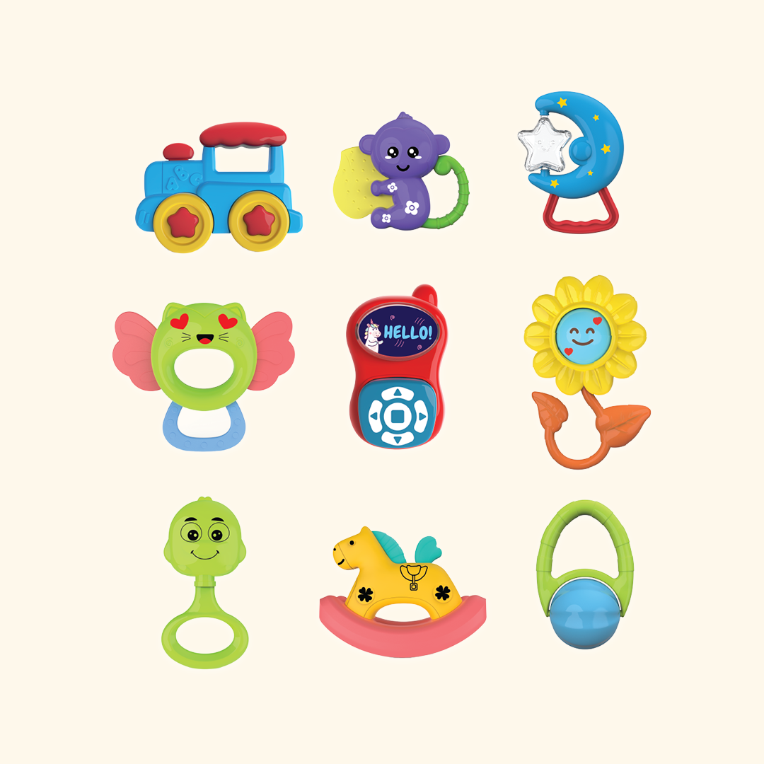 A bright, joyful mix of easy-grip rattles that shake, jingle, and delight! Cute characters, fun shapes, and gentle sounds make this set perfect for early sensory play.