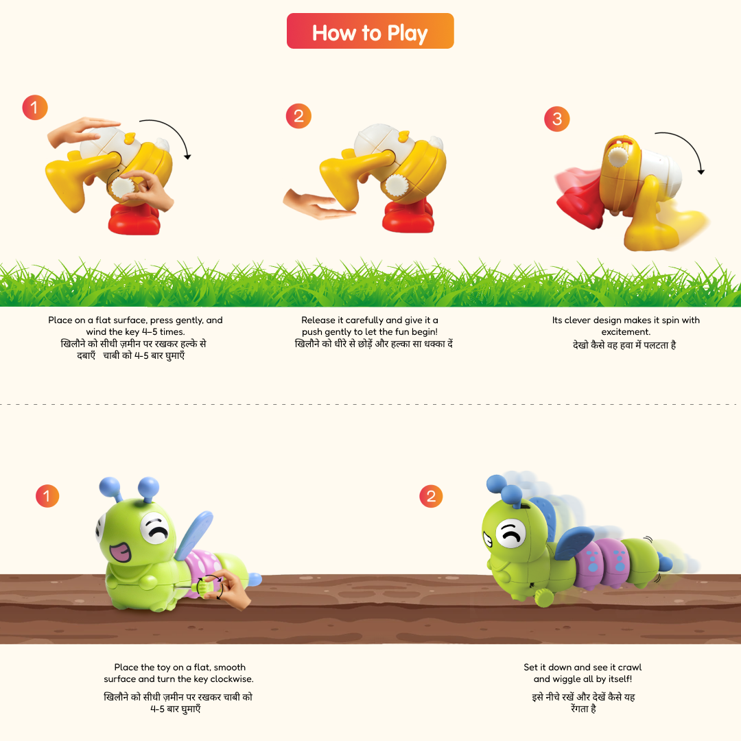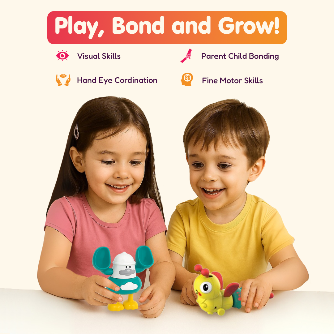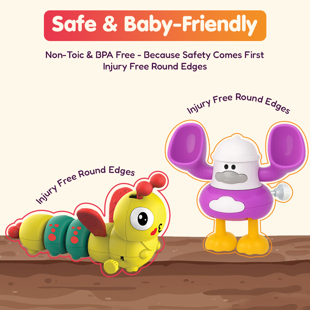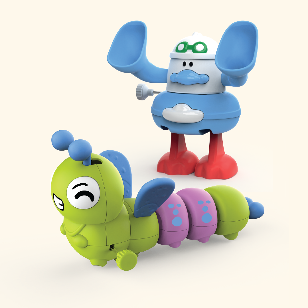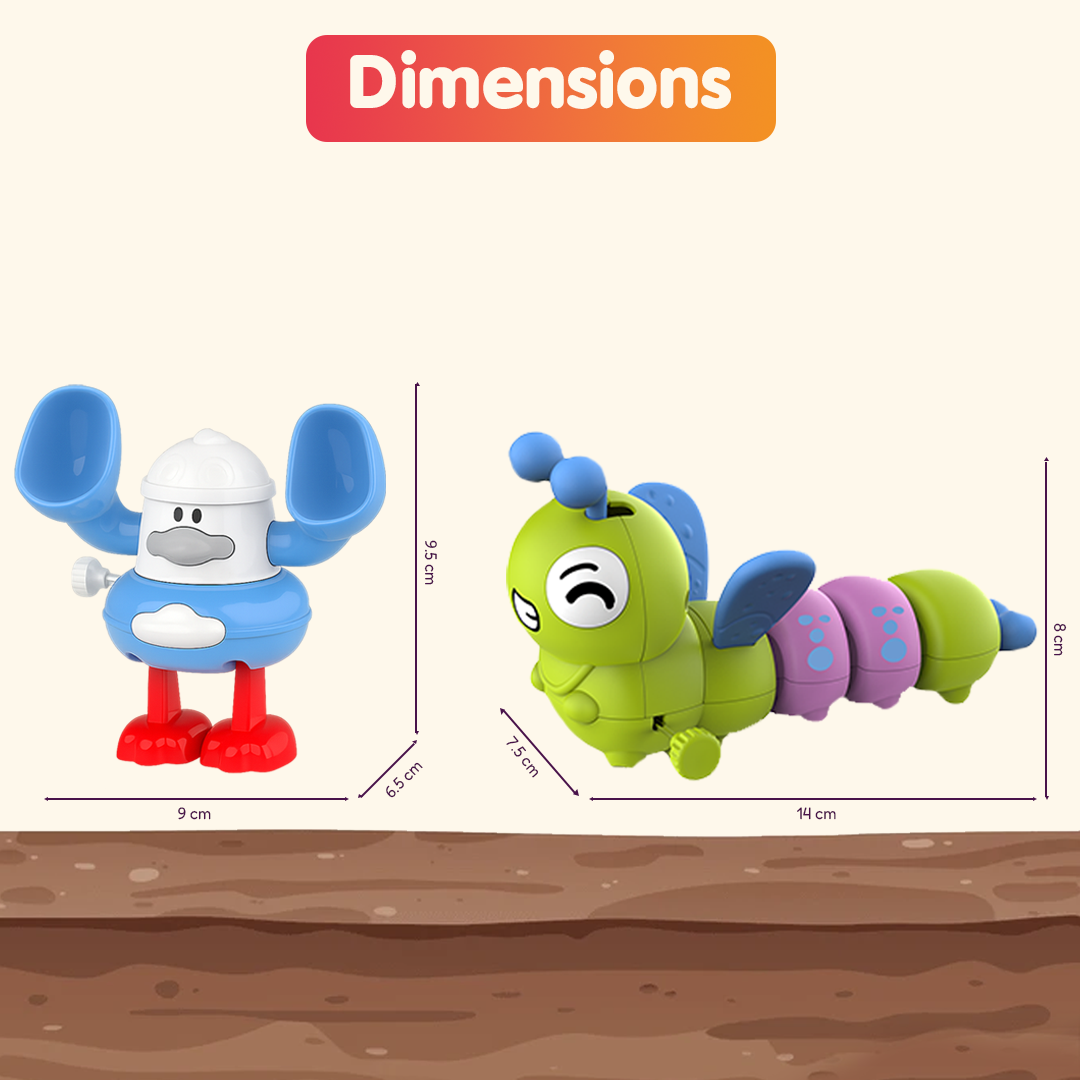 A playful 2-piece wind-up toy duo featuring a wiggly caterpillar and a goofy, big-earred character that walks with charm. Bright, durable, and perfect for fun, active play.