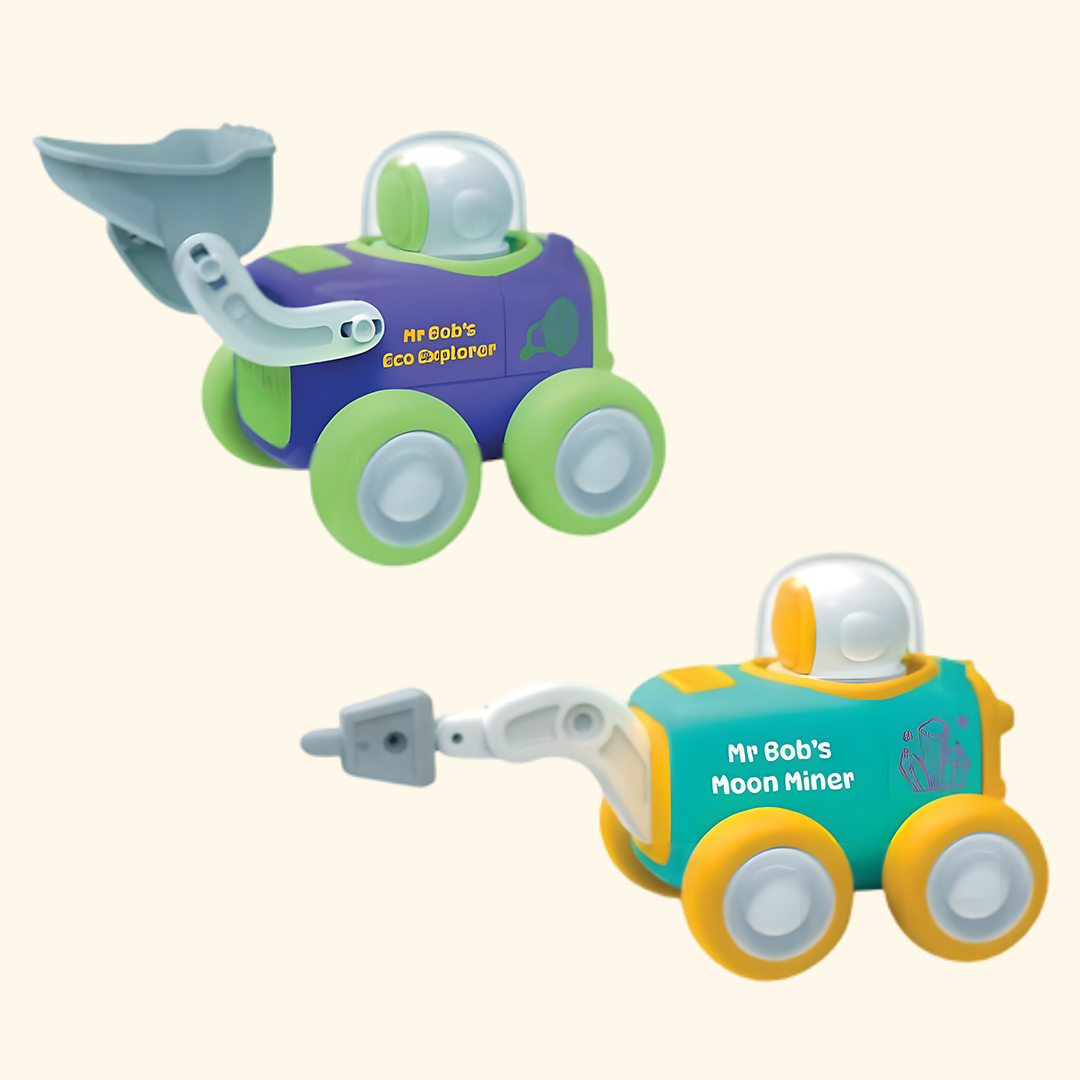 Two rovers, infinite missions! Blast off with this assorted 2-pack of Mr. Bob’s lunar vehicles, featuring different futuristic tools like the Eco Explorer scoop or the Moon Miner claw. You’ll get any two from the space crew! Perfect for duo exploration on any planet.